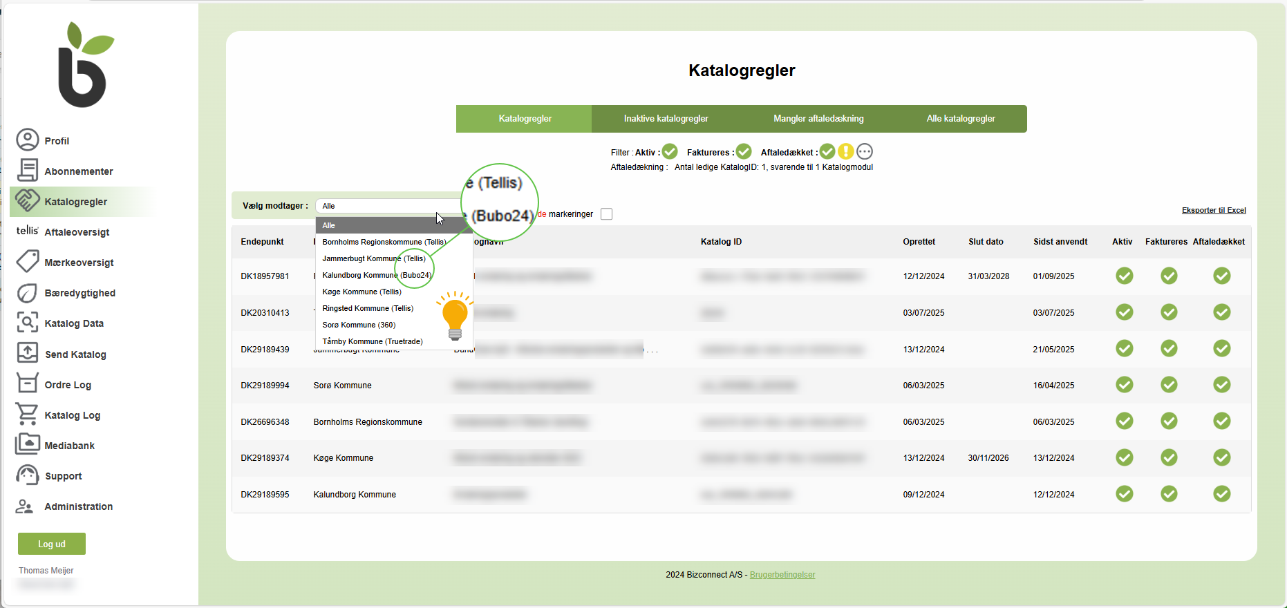 Katalogregler indeholder alle de aktive Katalog ID, som din virksomhed faktureres for. De kan enten være markeret som aftaledækkede, ikke-aftaledækkede, eller at aftaledækningen afventer en kørsel af Bizconnect for afklaring.